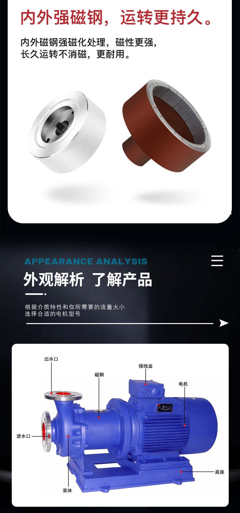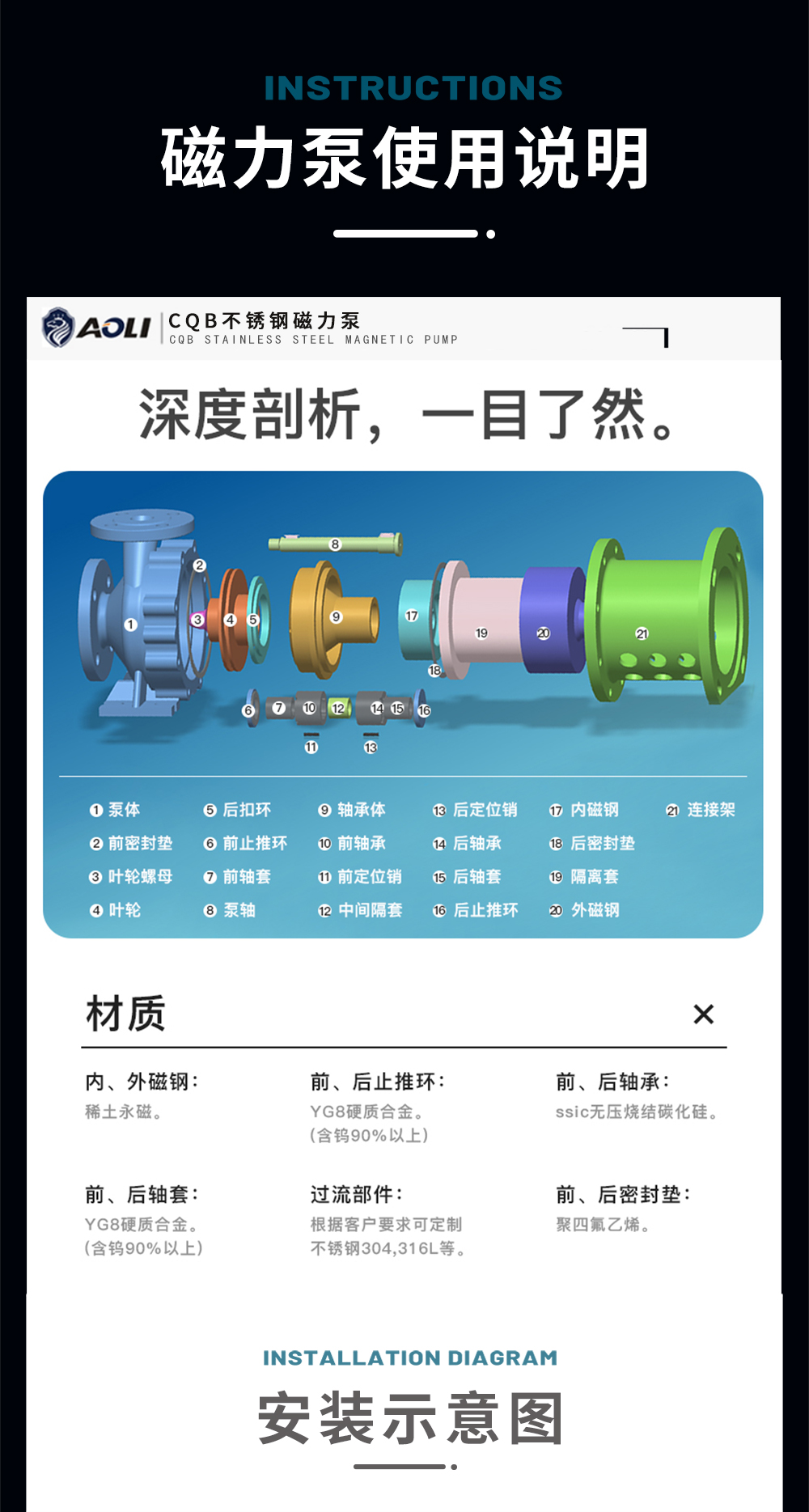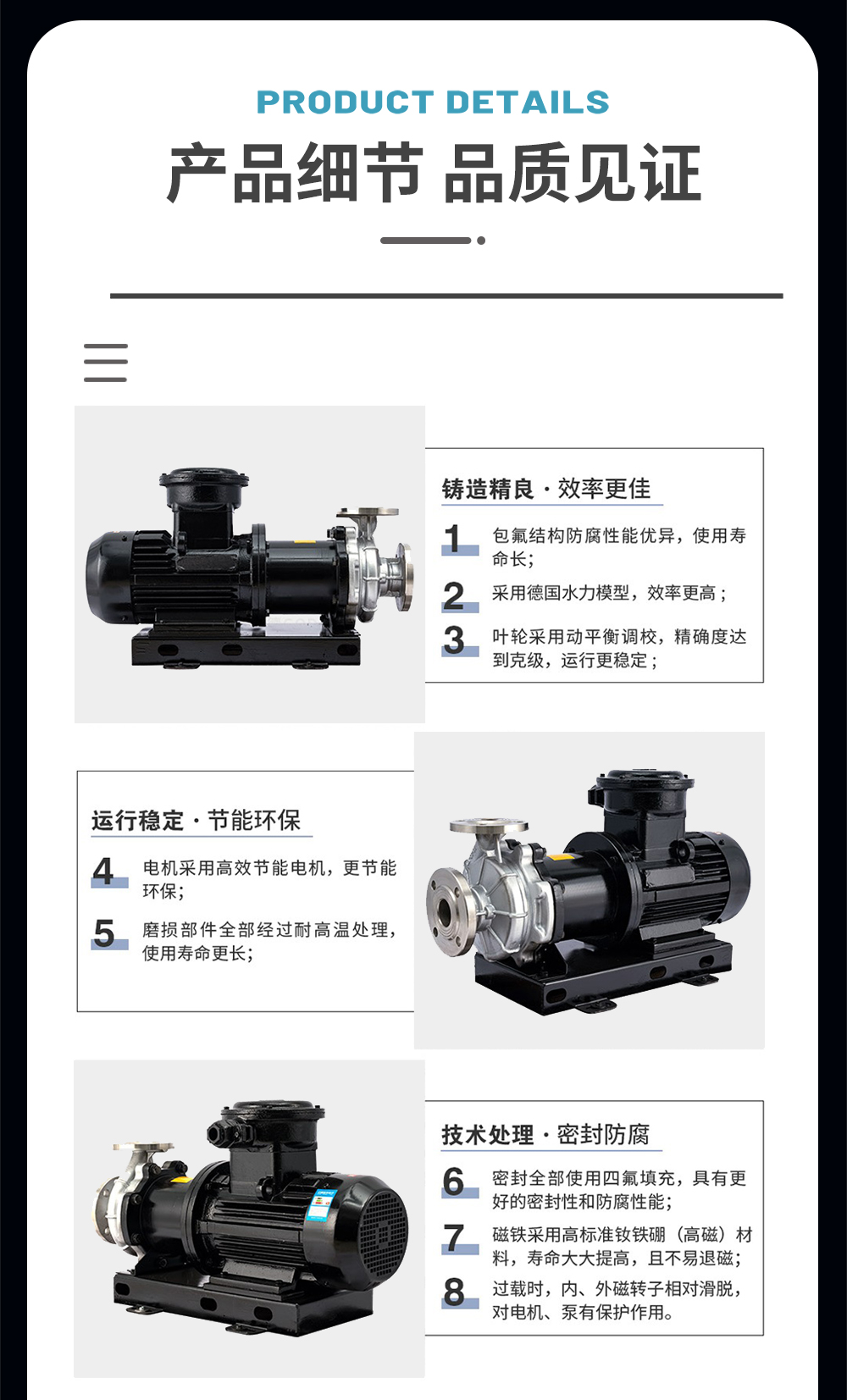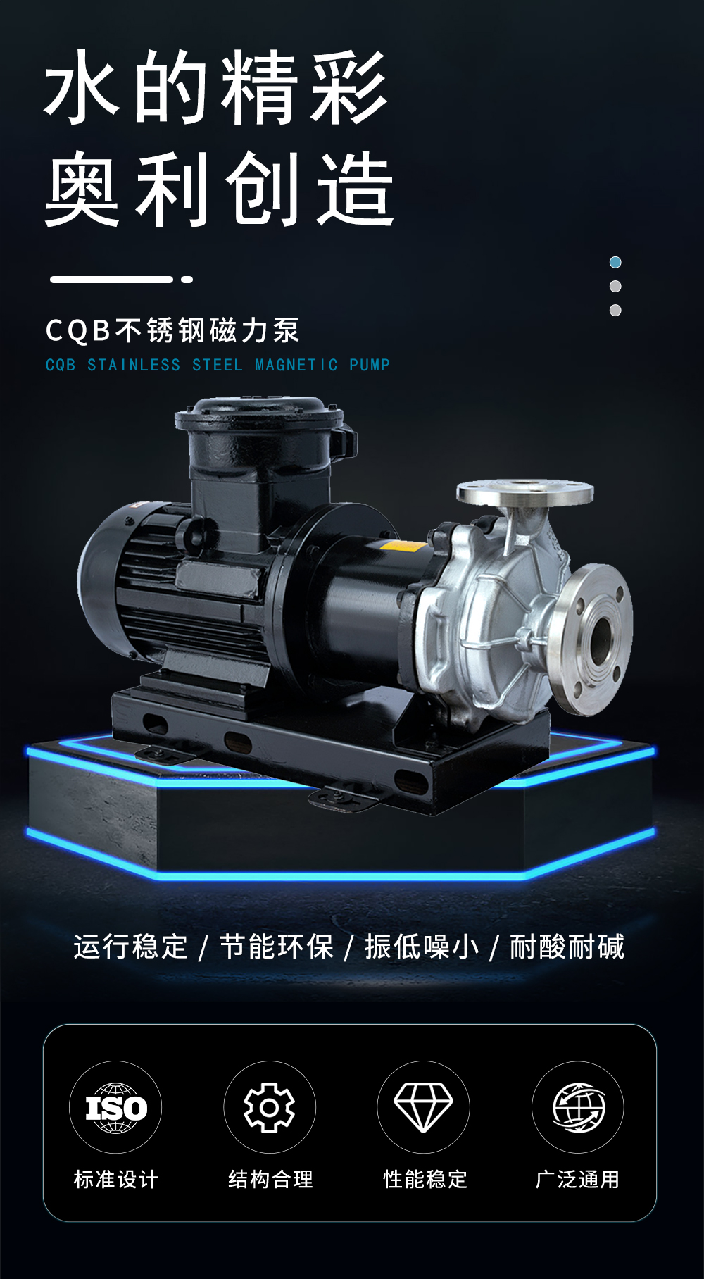 CQB不銹鋼磁力泵運(yùn)用CFX、CFD相結(jié)合分析計(jì)算得到高性能的水力模型,過流部件采用304、316L等優(yōu)質(zhì)不銹鋼材質(zhì),內(nèi)、外磁轉(zhuǎn)子選用高磁能積、高矯頑力的稀土永磁制造,具有高效節(jié)能、介質(zhì)適用面廣、耐高溫、磁性強(qiáng)、不退磁等優(yōu)點(diǎn),是應(yīng)用磁力耦合實(shí)現(xiàn)無接觸傳動(dòng)、無動(dòng)密封的新型高品質(zhì)磁力傳動(dòng)離心泵。全密封、無泄漏、清潔環(huán)保、運(yùn)行靜音低振,是輸送易燃、易爆、腐蝕、貴重液體的首選用泵。因節(jié)能環(huán)保、可靠安全,并替代進(jìn)口為用戶節(jié)約大量成本。廣泛應(yīng)用于化工、制堿、石油、醫(yī)藥、衛(wèi)生、農(nóng)藥、造紙、染料、污水處理等領(lǐng)域。