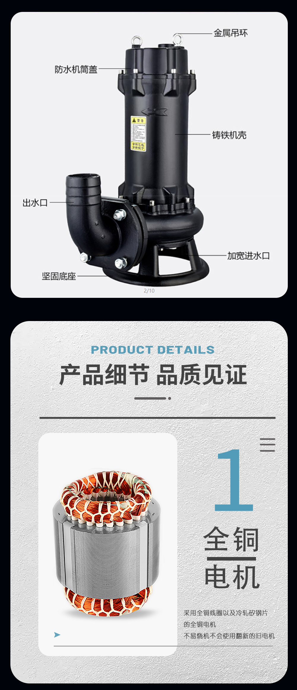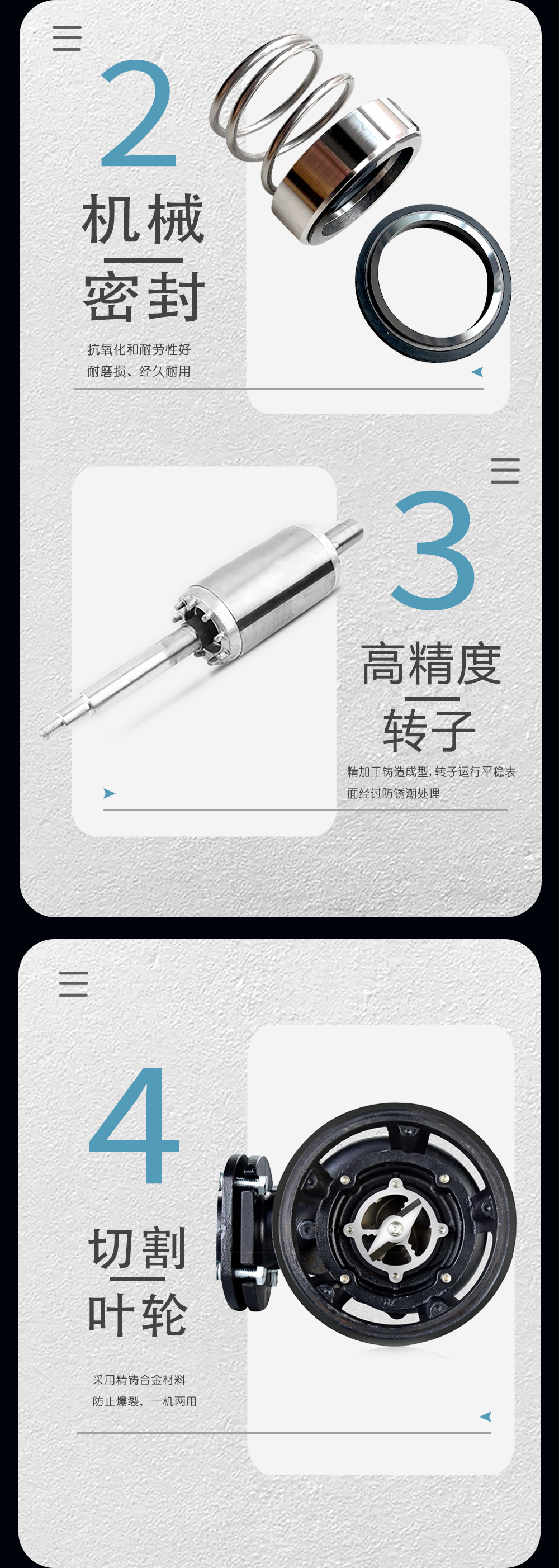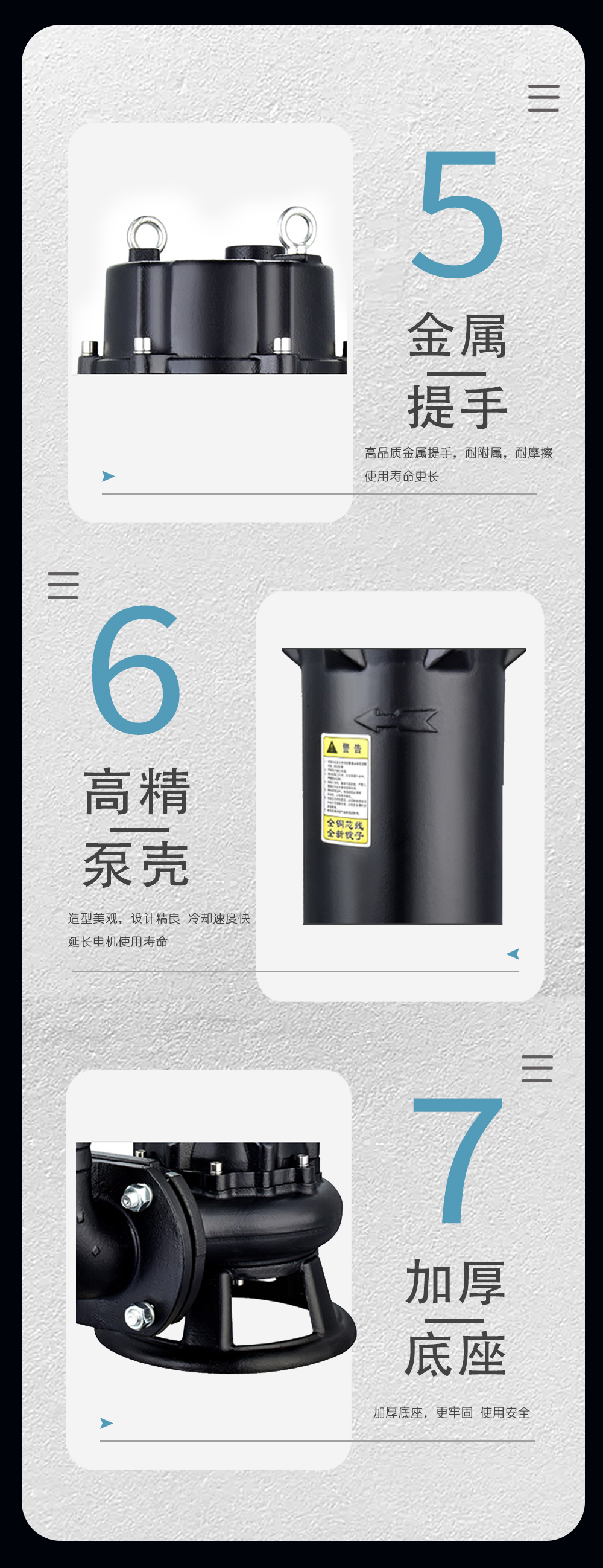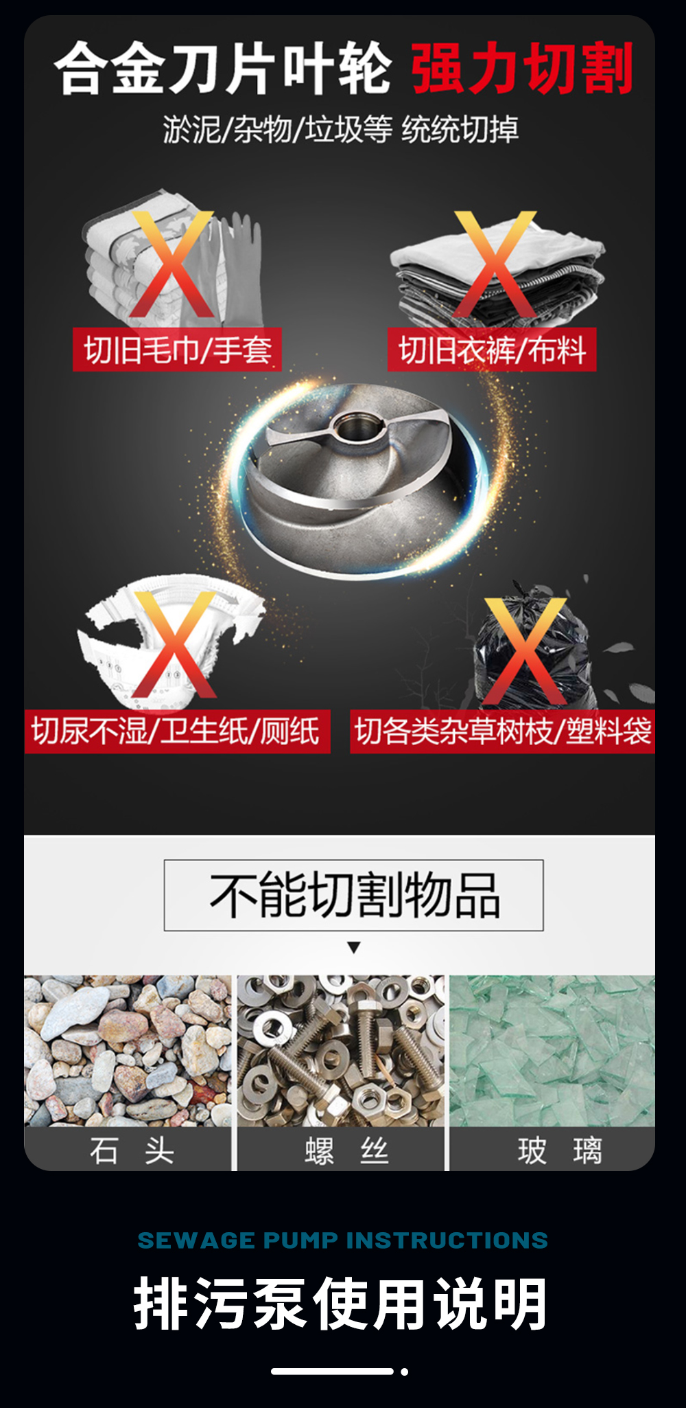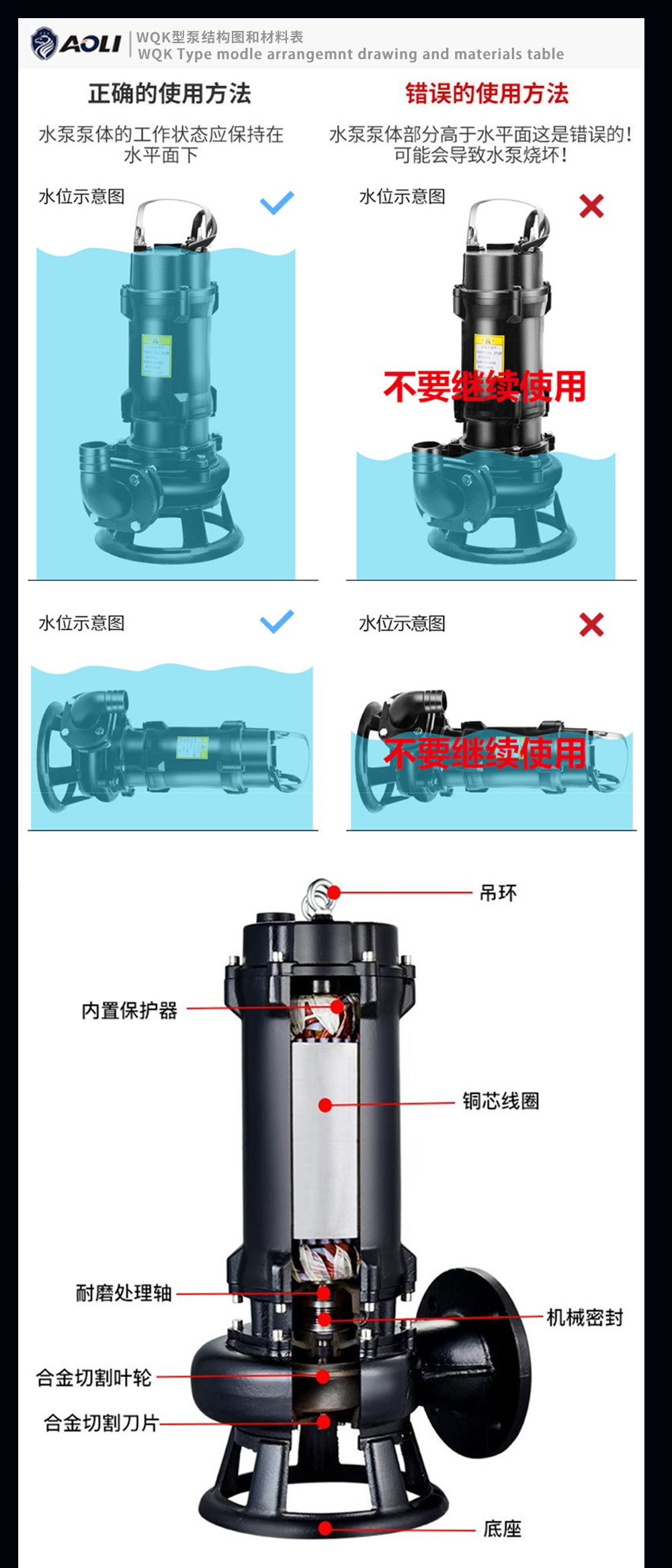 WQK/QG帶切割裝置排污泵具有排污通過(guò)能力特別強(qiáng),帶切割性能好,能將污水中的長(zhǎng)纖維、塑料、紙、帶、布條、稻草、繩子等雜質(zhì)切碎后排出,采用最先進(jìn)的方法,設(shè)計(jì)成最合理的水力特性,使電泵可以全揚(yáng)程運(yùn)行,優(yōu)良的干式電機(jī)和水泵的最佳組合,無(wú)堵塞排污泵使電泵的總效率達(dá)到西德abs公司的ass帶切割裝置系列產(chǎn)品相同,電泵采用高質(zhì)量的硬質(zhì)合金,雙端面機(jī)械密封和骨架油封組面部位,不得超過(guò)電動(dòng)機(jī)高度的1/2,抽送污物溫度不超過(guò)60℃。