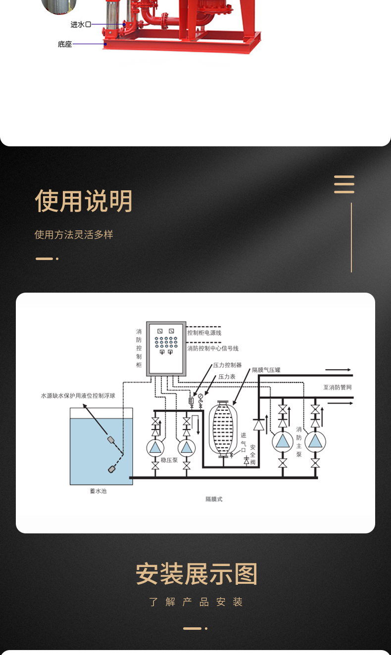 W-AL消防穩(wěn)壓給水設(shè)備是利用食品級橡膠作為氣水隔離的新型設(shè)備,一次充氣,常年運行使用。通過電接點壓力表和電控箱控制水泵運行,達到額定的壓力和連續(xù)供水。是按照國家消防設(shè)計規(guī)范GB50016《建筑設(shè)計防火規(guī)范》及國家標準 GB27898.3《固定消防給水設(shè)備第四部分∶ 消防增壓穩(wěn)壓給水設(shè)備》設(shè)計、制造的消防專用的增壓穩(wěn)壓設(shè)備。該設(shè)備由隔膜式氣壓罐、增壓泵、電控箱、儀表和管路附件等組成,適用于多層和高層建筑工程有增壓要求的消火栓給水系統(tǒng)及自動噴水滅火系統(tǒng)等各類消防給水系統(tǒng)。