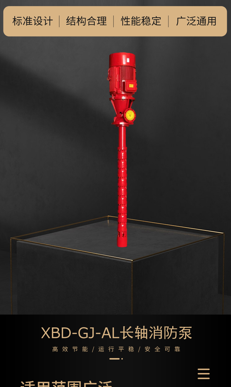 XBD-GJ長(zhǎng)軸深井消防泵是按照中國(guó)新消防泵新標(biāo)準(zhǔn)GB6245-2006《消防泵性能要求和試驗(yàn)方法》和美國(guó)消防協(xié)會(huì)標(biāo)準(zhǔn)NFPA20引進(jìn)開發(fā)的消防泵。產(chǎn)品經(jīng)中國(guó)消防裝備質(zhì)量監(jiān)督測(cè)試中心型式試驗(yàn),各項(xiàng)性能指標(biāo)全部達(dá)到標(biāo)準(zhǔn)要求,獲得消防產(chǎn)品認(rèn)可證書。長(zhǎng)軸消防泵由多個(gè)離心式葉輪和導(dǎo)流殼、揚(yáng)水管、傳動(dòng)軸、泵座、電動(dòng)機(jī)等部件組成。泵座和電機(jī)位于水池上方,電動(dòng)機(jī)的動(dòng)力通過(guò)與揚(yáng)水管同心的傳動(dòng)軸傳遞給葉輪軸,從而產(chǎn)生流量和壓力。