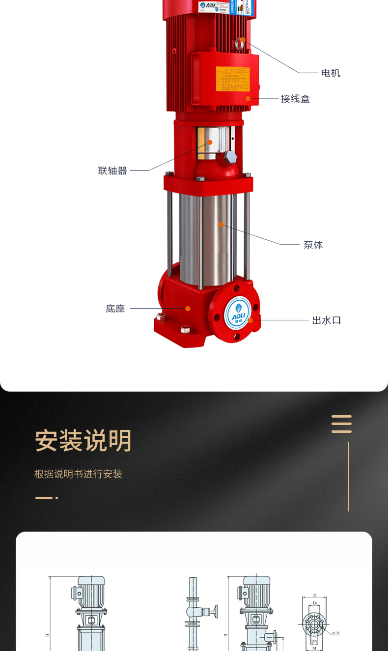 XBD-ALDM立式多級消防穩(wěn)壓泵,是在原有的ALDM立式多級泵的基礎(chǔ)上根據(jù)GB6245《消防泵》國家強(qiáng)制性標(biāo)準(zhǔn)要求進(jìn)行開發(fā)出的新一代中低壓消防穩(wěn)壓泵組產(chǎn)品。XBD-ALDM多級消防穩(wěn)壓泵在性能、結(jié)構(gòu)、材料和配套上均滿足GB6245 《消防泵》國家強(qiáng)制性標(biāo)準(zhǔn)的要求。由于采用優(yōu)秀的水力模型,因此該系列泵具有滿足用戶要求;采用立式泵結(jié)構(gòu),具有效率高、性能范圍廣的特點(diǎn),可更好的節(jié)省占地面積的優(yōu)點(diǎn);采用優(yōu)質(zhì)軸承和優(yōu)質(zhì)電機(jī),使泵運(yùn)行更為安全可靠、噪音低、振動小;采用水力平衡軸向力,減少平衡鼓,可使運(yùn)行更為平穩(wěn)。其