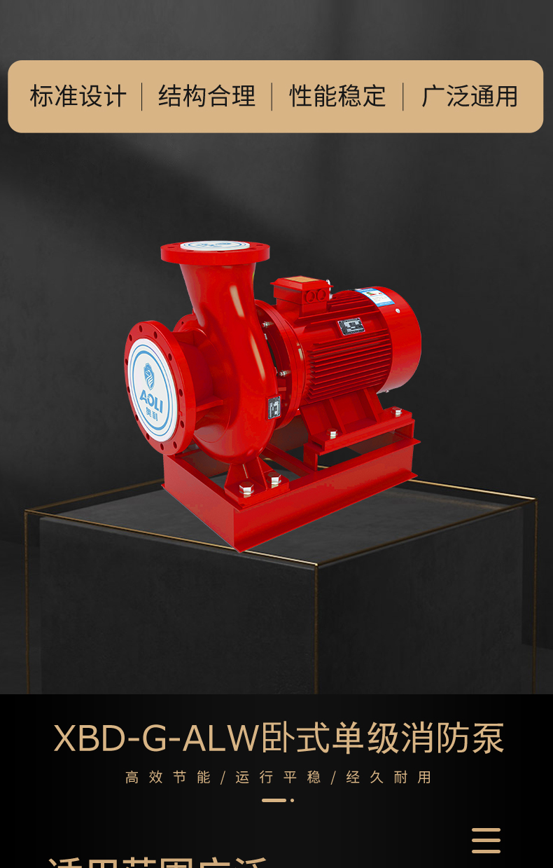 XBD-ALW臥式單級消防泵是一種消防用具,供輸送不含固體顆粒的清水及物理化學性質類似于水的液體之用,主要用于消防系統(tǒng)管道增壓送水和各種場合的消防給水(消防栓滅火系統(tǒng)、自動噴淋滅火系統(tǒng)和水噴霧滅火系統(tǒng)等),也可適用于工業(yè)和城市給排水,高層建筑增壓送水、遠距離送水、采暖、浴室、鍋爐冷暖水循環(huán)、增壓空調制冷系統(tǒng)送水及設備配套等場合。